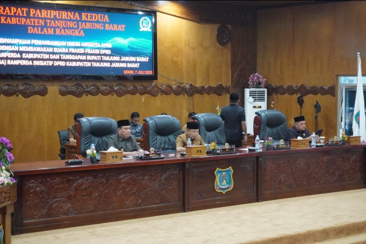 Tanjabbar – Dewan Perwakilan Rakyat Daerah (DPRD) Kabupaten Tanjung Jabung Barat (Tanjab Barat), menggelar Rapat Paripurna dengan agenda Penyampaian Nota Pengantar terhadap 2 Rancangan Peraturan Daerah (Raperda) usulan Pemerintah Kabupaten Tanjung Jabung Barat serta 3 Raperda Inisiatif DPRD, Senin (7/7/25),Beberapa waktu lalu di Ruang Rapat Utama DPRD Tanjab Barat.